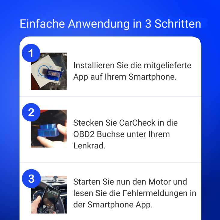 2. Plug-and-Play-Bedienung – auch für Anfänger einfach zu bedienen, ohne technische Vorkenntnisse – OBD-Stecker einstecken, App starten, Diagnose beginnen.